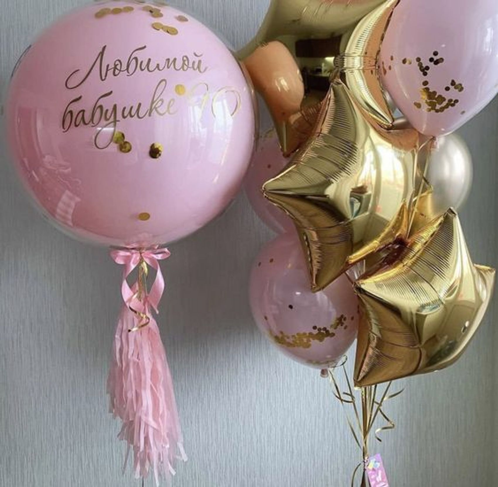 - 1 Шар гигнат (Дабл Стафф) с конфетти, лентой тассел и надписью.