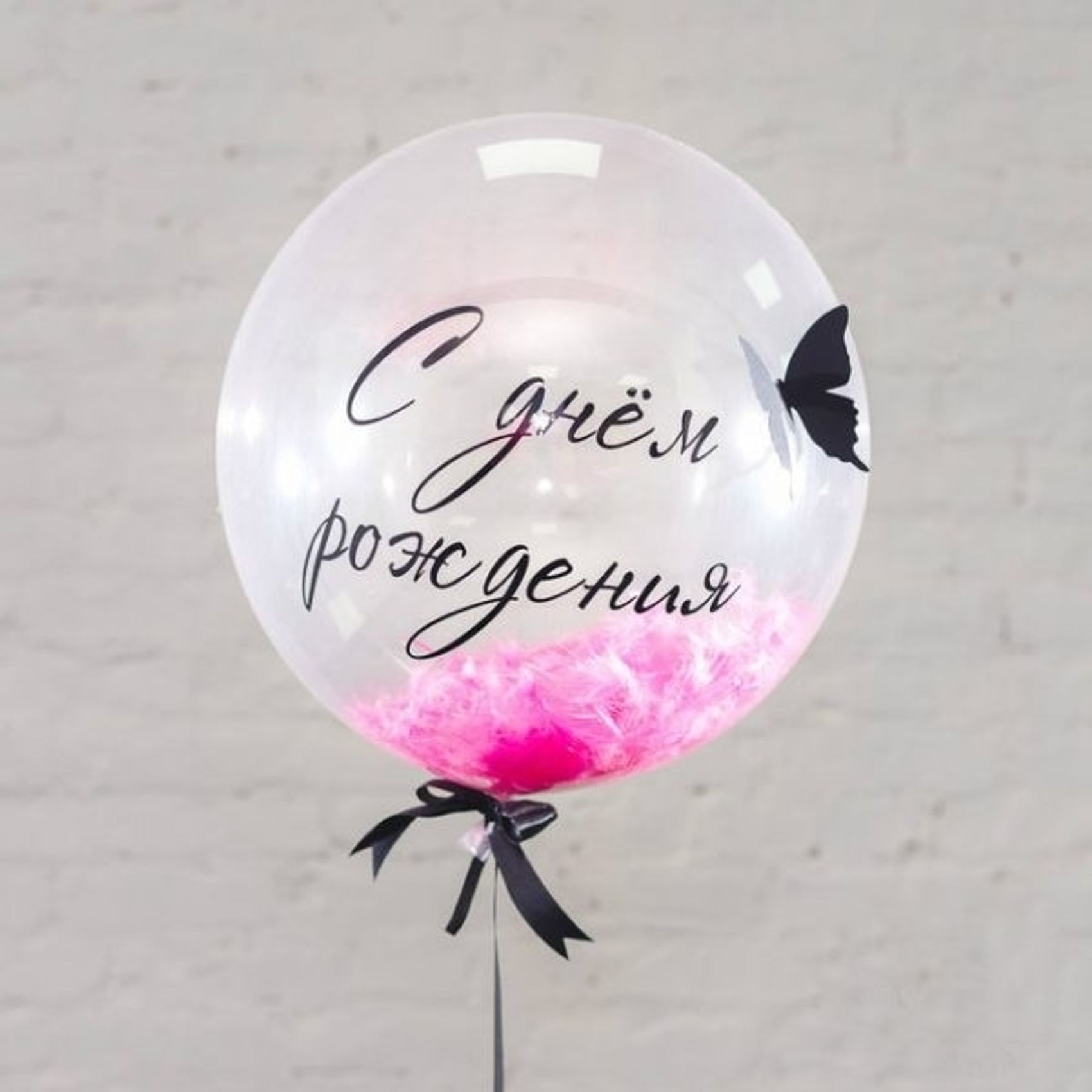 -Шар Баблс с перьями (розовые), бабочкой и надписью